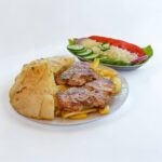 2 ćevapa, 1 kobasica, 2 šiša, 2 rolovana ražnjića, male pileće krpice, mali batak, pomfrit, 2 lepinje. 720 gr