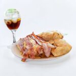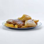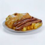 3 ćevapa, 2 kobasice, 2 šiša, 2 rolovana ražnjića, 2 teleća ražnjića, mala peka, mala bijela vješalica, male pileće krpice, mali batak, pomfrit, 4 lepinje, 1.180 gr