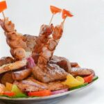 Mala porcija 180 gr - ćevap, kobasica, rolovani ražnjić, srednja porcija 260 gr - ćevap, šiš, kobasica, rolovani ražnjić, velika porcija 360 gr - ćevap, šiš, kobasica, rolovani ražnjić, mala vješalica
