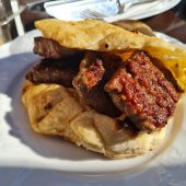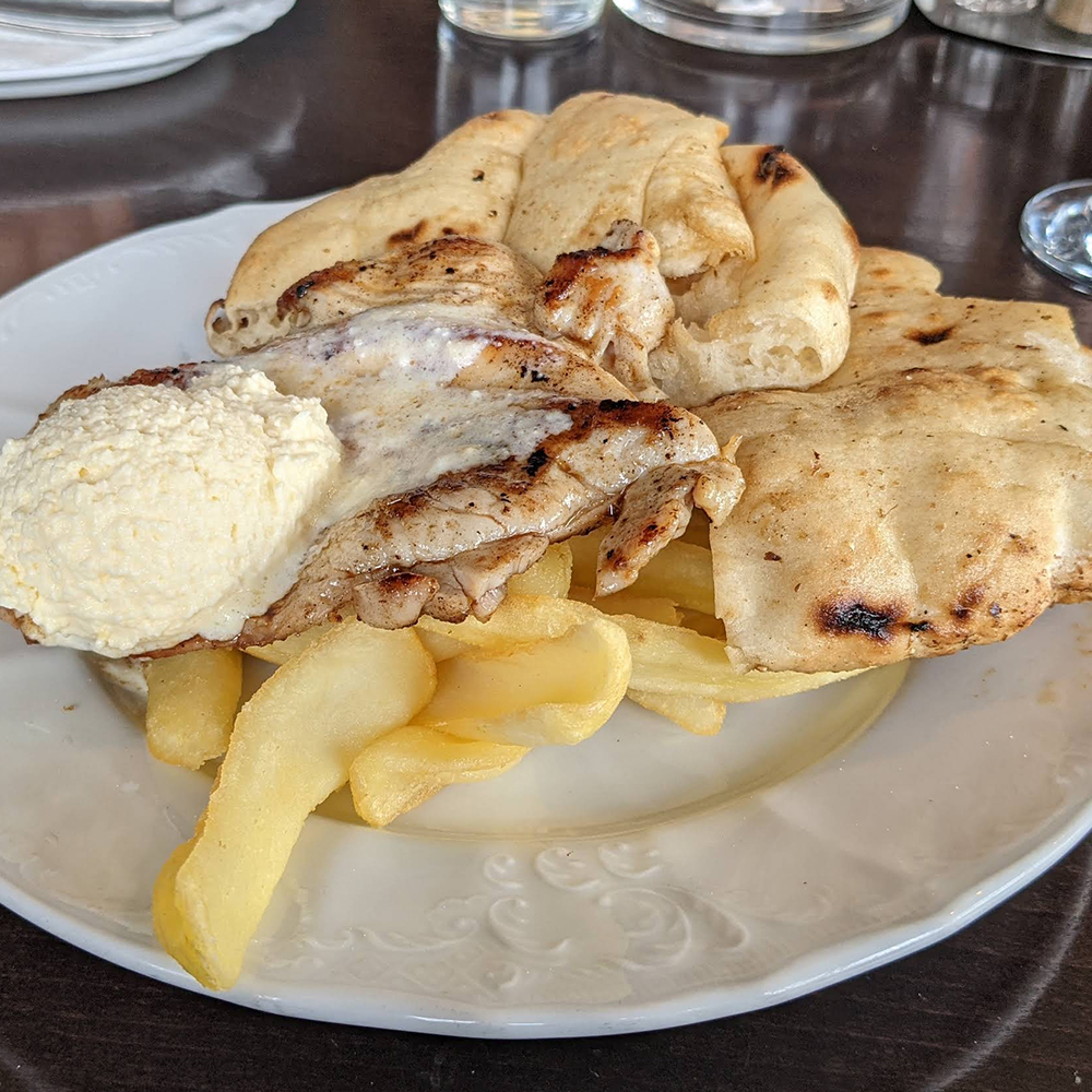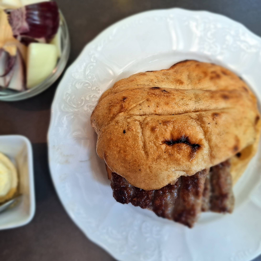 3 ćevapa, 2 kobasice, 3 šiša, 3 rolovana ražnjića, male pileće krpice, mali batak, pomfrit, 3 lepinje. 990 gr