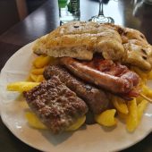 2 ćevapa, 1 kobasica, 2 šiša, 2 rolovana ražnjića, male pileće krpice, mali batak, pomfrit, 2 lepinje. 720 gr