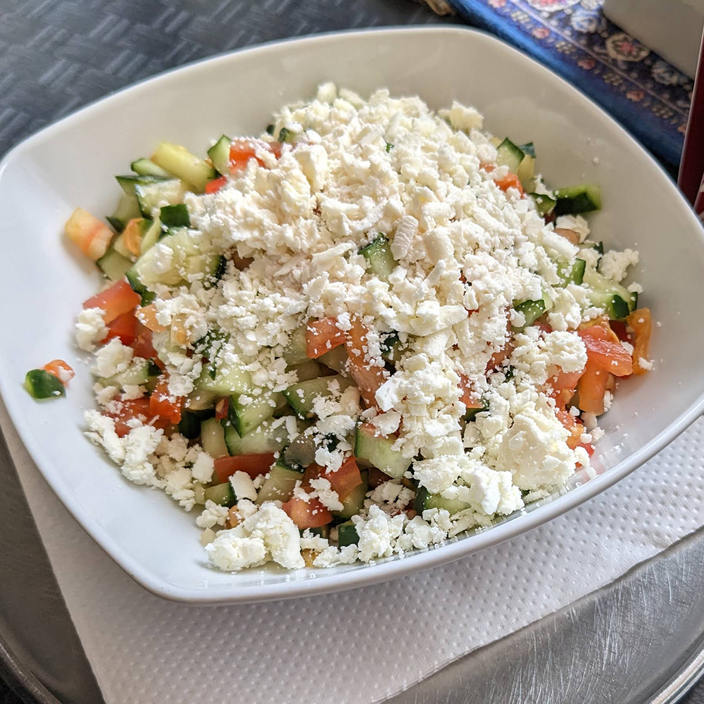 Istinsko uživanje u svježem, a mesnom obroku sačinjeno je od zelene salate, kupusa, paradajza, kukuruza, krastavca te kockica sira feta i komadića sočnog bifteka. (velika)