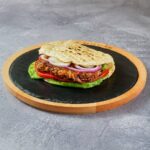 150g čistog junećeg mesa, topi sir, panceta, iceberg, paradajz, kiseli krastvčići, ljubičasti luk, burger sos