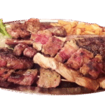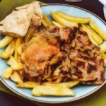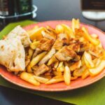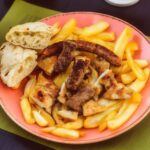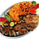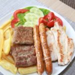 Pileći ćevapi 2 komada, male pileće krpice, 1x roštiljska kobasica, 1x pileći ražnjić, mali pileći mišići, prilog pomfrit
