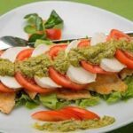 Piletina sa mladom Mozzarellom, paradajzom i pesto Genoveze sosom, zelena salata