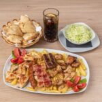 Pecivo, pileći ćevapi 2 komada, male pileće krpice, 1x roštiljska kobasica, 1x pileći ražnjić, prilog pomfrit