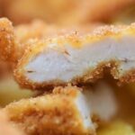 Pileći file pohovan u kornfleksu na prilogu od riže i pomfrita preliven kikiriki sosom