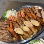 8x ćevap, 4x gurmanski uštipak, 4x gurmanski ražnjić, 2x punjena vješalica, 2x domaća dimljena kobasica, 1x pljeskavica, mladi pečeni krumpir, pomfrit, šampinjoni na žaru, zapečeni grah, šopska salata, poriluk, zelje, 4x lepinja