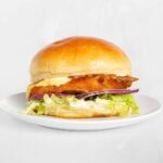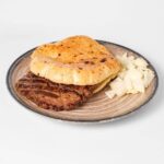Pljeskavica 100 % junetina s Hrvatskih paΕ‘njaka punjena sirom, lepinja, luk