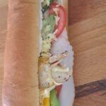 Pohovana piletina, somun, zelena salata, paradajz, krastavac, majonez, pavlaka.